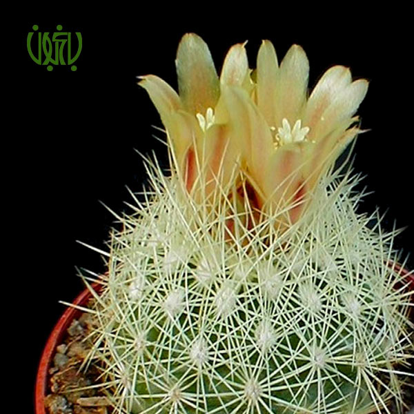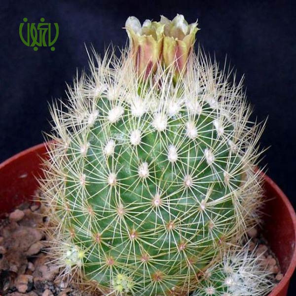 این گیاه از خانواده کاکتوس ها می باشد که شکل ظاهری آن بیضی و گرد، رنگ سبز تیره و دارای تیغ های سفید دسته ای بلند که توسط آرئول ها دسته بندی شده اند و گل هایی به رنگ صورتی .گل ها با تولید میوه های باریک تولید بذر می کنند.