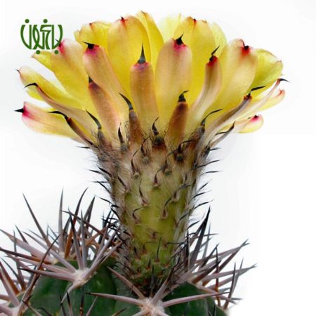 این گیاه از خانواده کاکتوسها می باشد که شکل ظاهری آن کروی و دارای شیار و با تیغ های برجسته است با گل هایی به رنگ زرد و صورتی و قرمز.